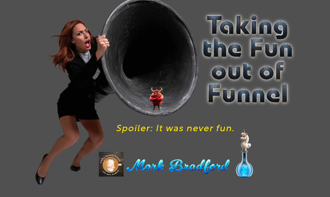 Have I said how funnels feel icky to me? Well, hey there. Welcome back. Do you like funnels? I don’t mean like for refilling your oil or delicious funnel cakes. I mean, well, let’s let’s talk about this. So, as many of you know, there’s a concept called the sales funnel. It’s a process where you get someone into a process and kind of help them along the way to purchase your product. Now, you don’t see this that often with physical products. There’s a whole different way of dealing with that, but you do see it for services, especially certain kinds of services. And sure enough, if it’s a service that kind of gives you pause, it’s probably one that has a funnel associated with it. Funnels don’t feel good, no matter how well they’re built. And if you’re like me, you know right away when you’re in one. Are you in one now? Are you thinking that right now that by listening to my podcast, you’re in my funnel? Because if you’re listening to the podcast, doesn’t it mean that you’re starting to kind of buy into how uh I approach things, which means you might actually buy one of my books and then you might actually hire me to speak or to coach you. So, Mark, isn’t this a funnel? Well, not intentionally. I mean, there’s nothing making you move forward. Nothing in this podcast builds momentum. There is a bumper at the end right when you normally turn it off that says, “Hey, if you like this, you know, you can buy my books or do this or do that or whatever, but it’s not really a funnel. My books tell you a little bit about the other stuff that I do, but mostly they just say, “Hey, here’s the other stuff I do.” And uh if you want to rate this, that’d be great. I don’t go out of my way when it comes to coaching people to shove them into a funnel either to get them to pay, to get them to buy. I want them to make an informed decision. So, does that make me definitely not an expert on funnels? It definitely makes me someone who doesn’t construct them very well because I’m too focused on the product.