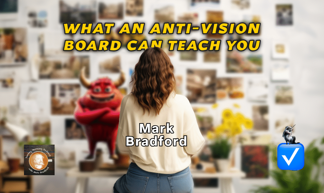 I started thinking about vision boards when I was looking at my CheckMark™ app. And if you haven’t checked it out, you should because I built a vision board into it. Uh, you can use your camera on your phone. You can upload photos to it and arrange it on your phone. It’s kind of cool. Mind you, it’s a small screen, but it’s kind of ever-present, which is cool. And you can look at it on your computer when you get back to your office. I broke the boards down into a number of boards like relationships and health and so forth. But that got me thinking. I felt like there was a board that was missing. What if you flipped everything around and you made a board of all the things you didn’t want? Now, if you literally made a board of the things you don’t want, that would you’d run out of board. Obviously, there’s a million things in life we don’t want, then there are probably just a few things that we really do want. But what if the things we don’t want are sometimes the things we have, right? Like if you’re in a job that you really don’t like, well, that’s something you’d put on that special board. And let’s call it an anti- vision board, right? It’s not my vision.